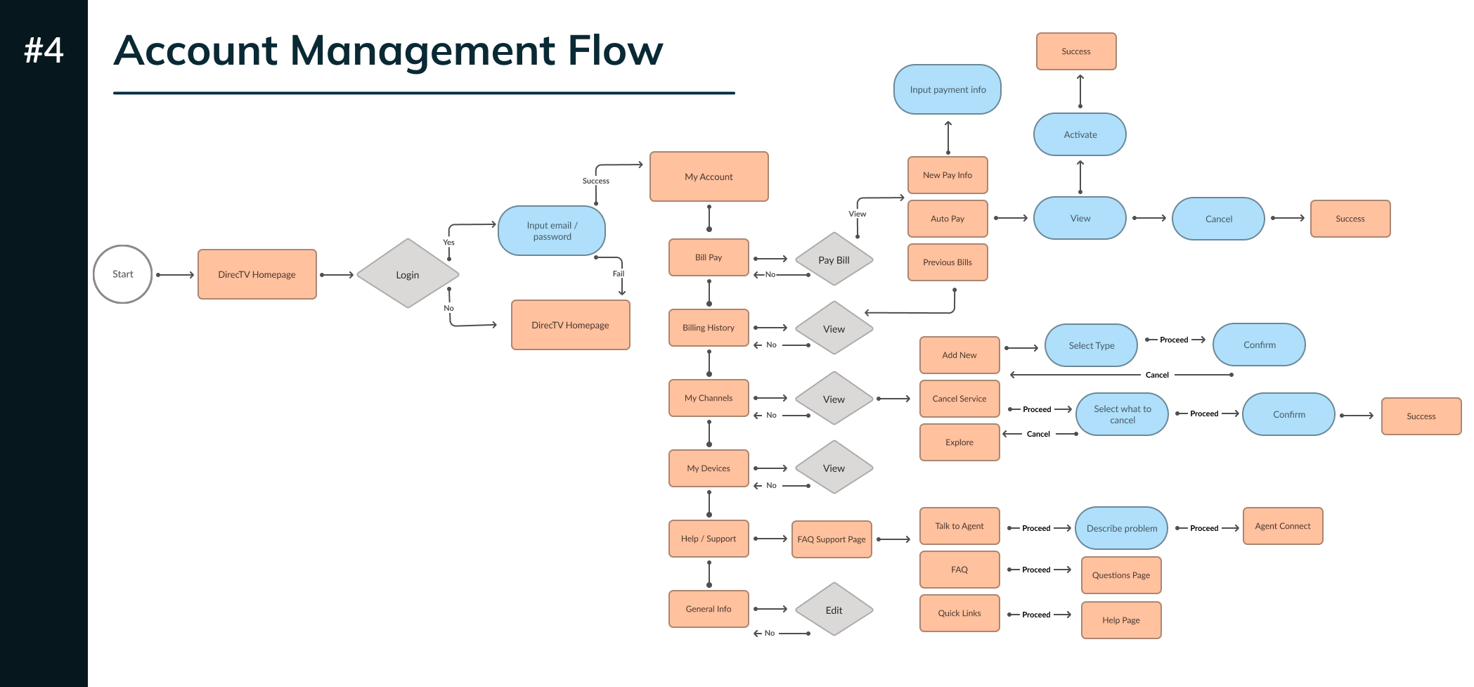 To translate research insights into actionable design, I created detailed user flows that mapped how customers move through core tasks such as paying bills, managing channels, updating devices, and troubleshooting.