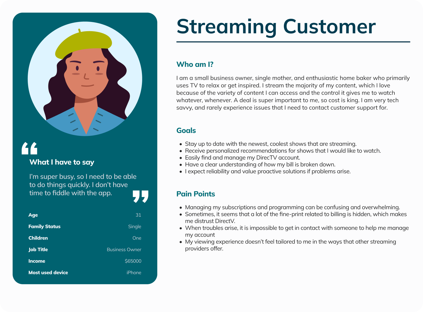 Through user interviews and affinity mapping, we identified two core customer segments: the streaming customer, who values speed, personalization, and transparency, and the satellite customer, who prioritizes reliability, sports access, and responsive support. By grounding our design decisions in the needs of both groups, we ensured the solutions balanced modern convenience with trusted dependability.
